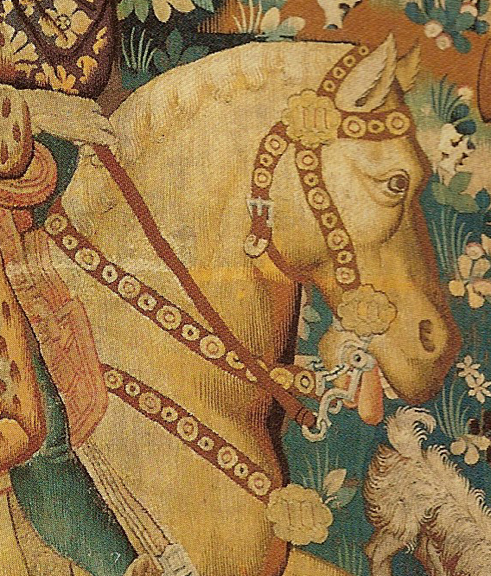 In January, I was looking through "Medieval Life and Leisure in the Devonshire Hunting Tapestries" (Linda Woolsey, V&A Publications, 2002) and several very attractive sets of horse tack and trappings really caught my eye as well as my imagination. Tapestry #2 Falconry shows various members of a hunting party as well as several horses. One of those horses particularly caught my eye because it was fitted with red trappings with gold colored fittings and harness mounts and red's my favorite color. The tack on that horse was so smashing and depicted in such fantastic detail, I vowed to make a reconstruction of the bridle. I've never had a fully detailed and completely accurate bridle and my horse Petrus was very much in need of some medieval kit. The plan was set.
